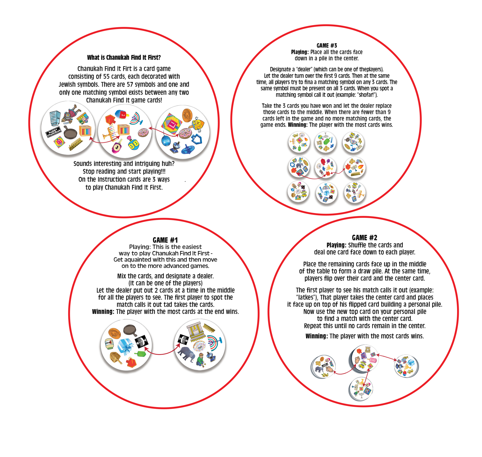 The "Chanukah Find it First" game is a Chanukah-themed card game where players race to find a matching symbol on round cards. It's a "spot-it" style game that includes Chanukah symbols and comes in a tin box. The game is designed for 2-8 players, ages 6 and up, and has 55 round cards