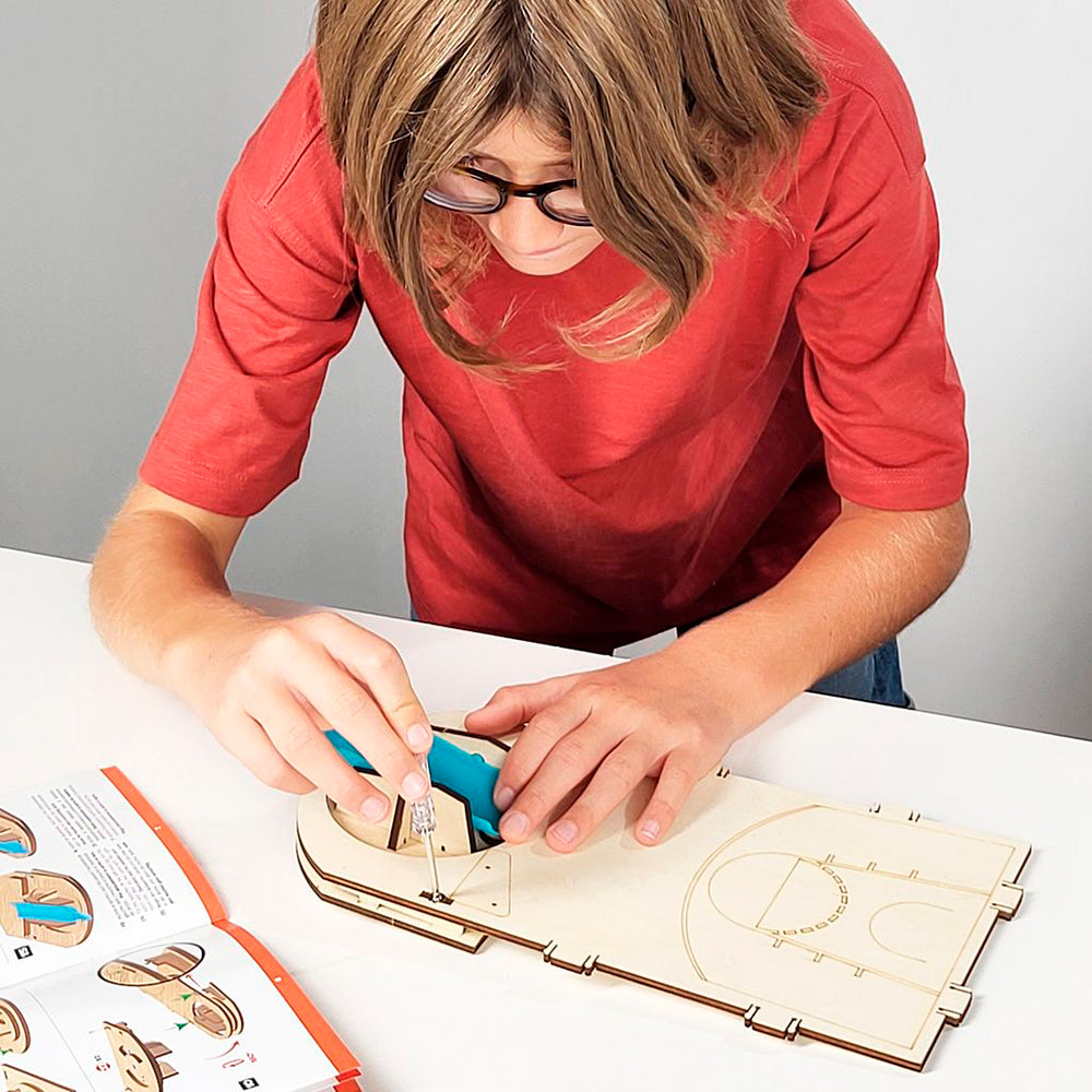 A kit to build your own electronic basketball hoop. Using the included screwdriver, children can safely assemble the scoreboard, control panel, speaker, and battery compartment – no soldering required. Customise the hoop with the included stickers.