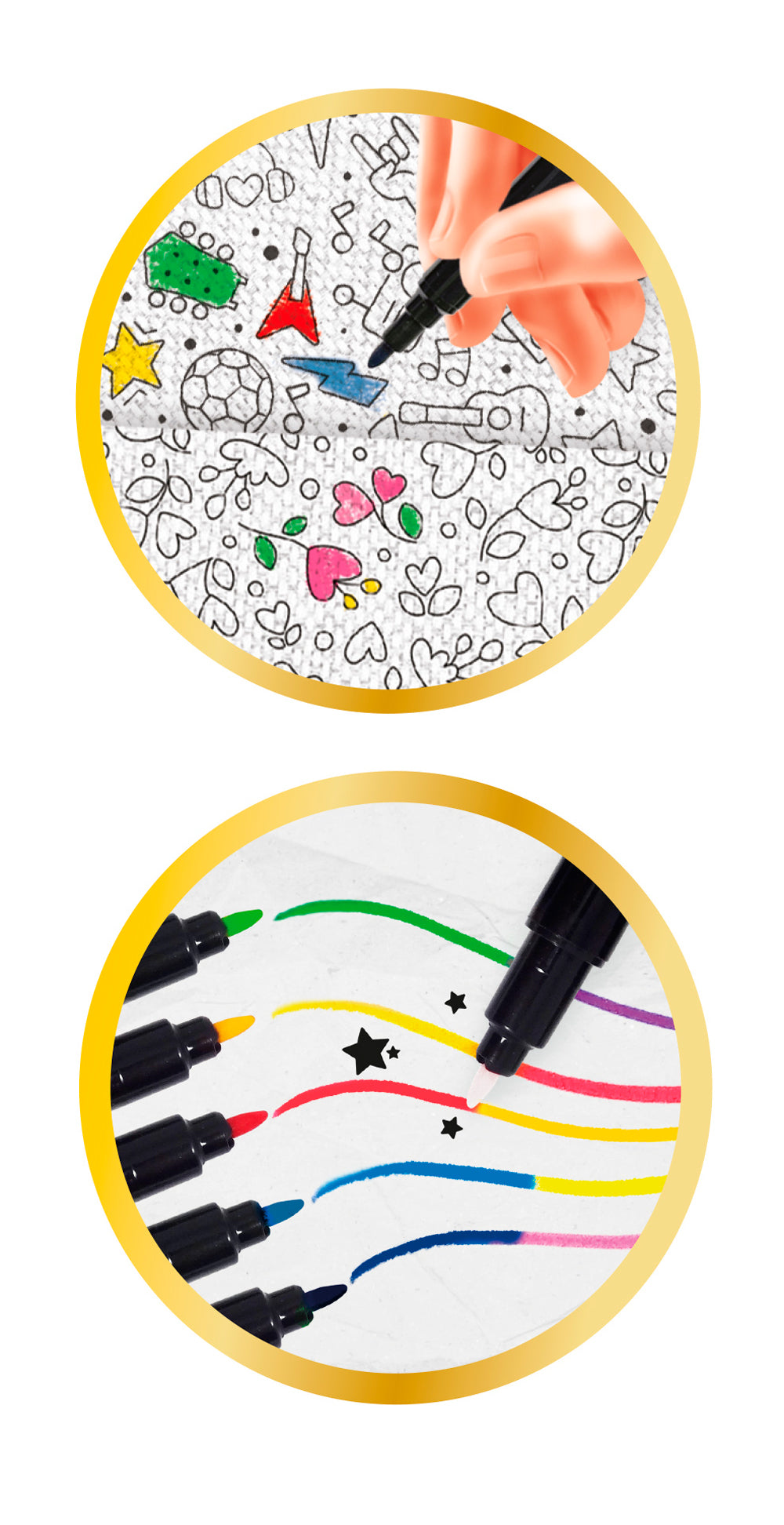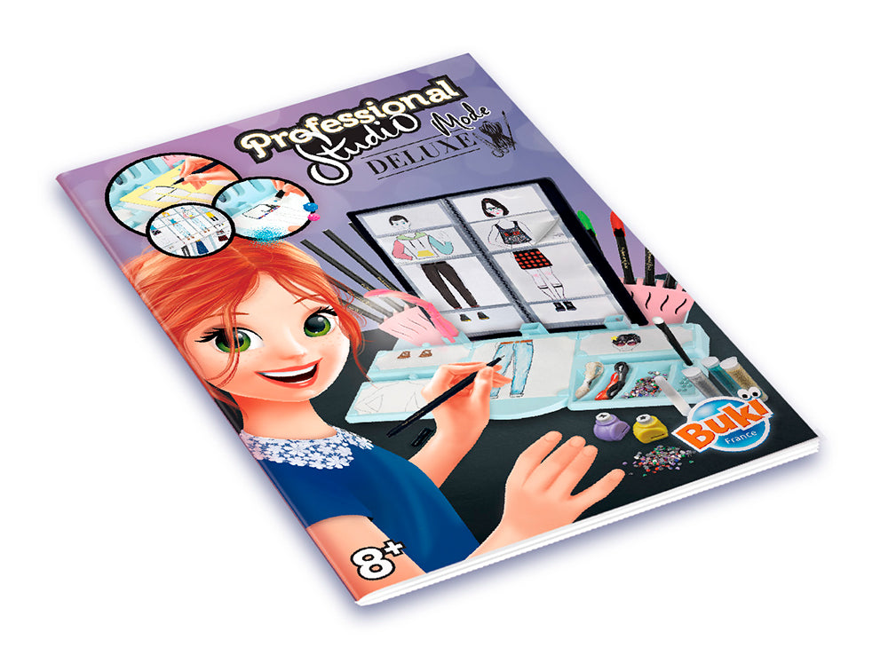 Numerous accessories: magic markers, adhesive fabrics, coloring adhesive fabrics, watercolor pencils, LED lamp, 2 hole punches, rhinestones, ribbons… Illustrated instructions in color.