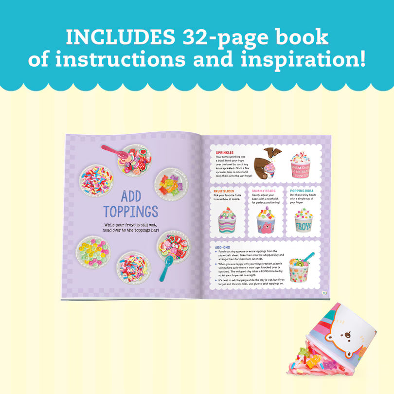 Make fake froyo with air-dry clay!It's a tiny froyo shop in a box! Make tiny too-fake-to-eat treats with air-dry whipped clay and custom toppings in mini cups. Choose from six step-by-step projects such as swirly froyo in a cup, a taiyaki fish cone, or a decadent sundae in a waffle bowl -- or mix-and-match the materials to make up to 12 projects. The whipped clay comes in two colors with two piping tips, so you can pipe the clay just like frosting. Craft supplies mimic candies like sprinkles, popping boba, gummy bears, and fruit slices. Display your finished crafts on the miniature papercraft counter to complete your cool little shop.
