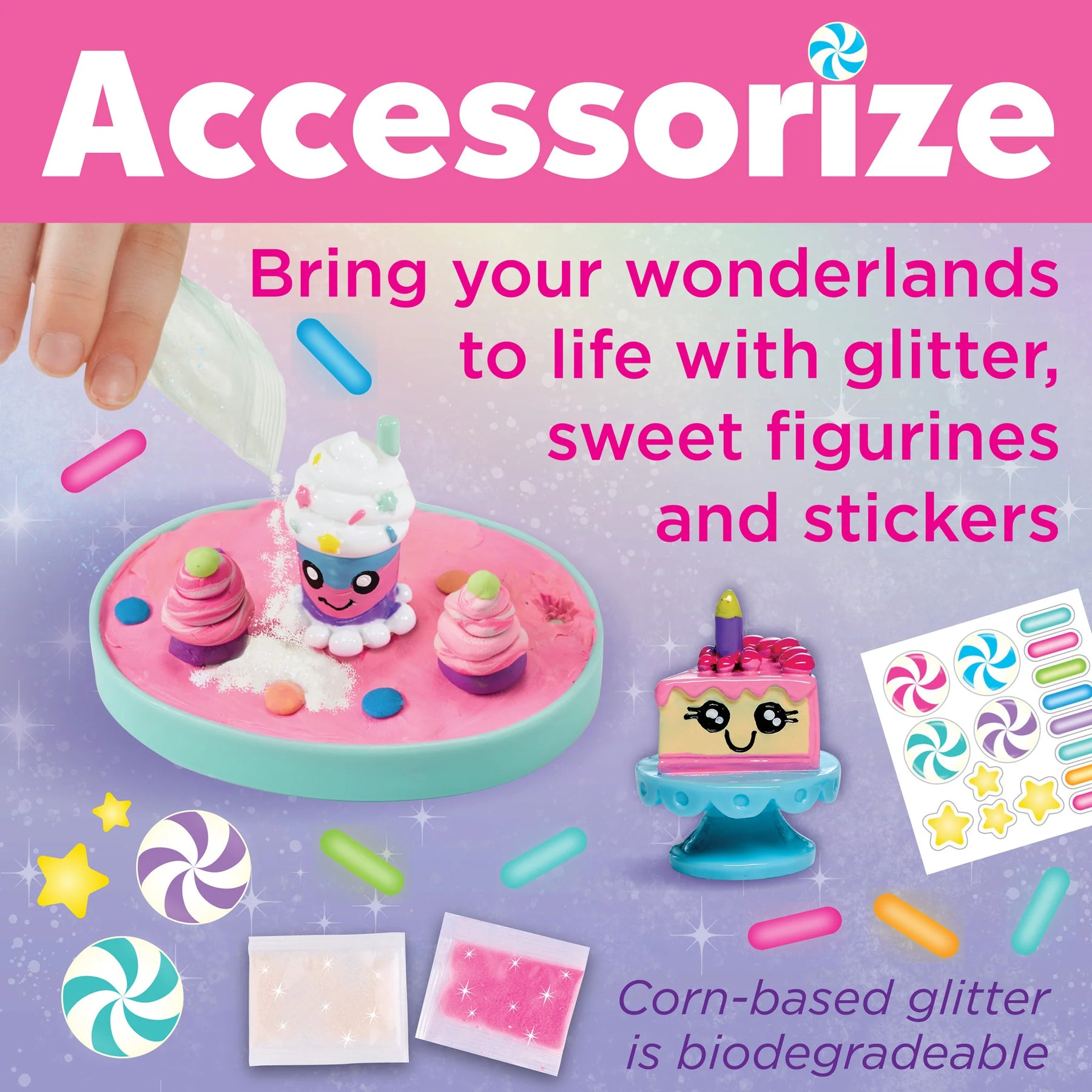 The kit includes 2 child-safe plastic globes (each measuring 2 7/8” W x 3 5/8” H x 2 3/4" L), sculpting clay, plastic tools, a funnel, waterproof glue, themed stickers, display trays, and step-by-step instructions. Kids will love learning how to mix and swirl clay colors to make rainbow taffy, swirl candy, and more perfect for budding artists who enjoy mixing colors and textures to match their vision.