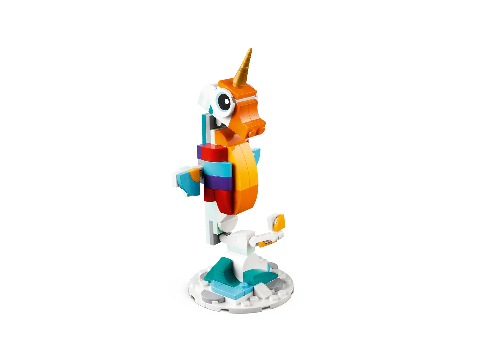 The mythical action never stops with 3 different magical creatures for little builders to assemble in this LEGO Creator 3in1 set. They can build a posable Magical Unicorn, rebuild it into a posable seahorse toy with a seabed stand, turn it into a posable magical peacock with a colorful tail, or even use the bricks to create another enchanting creature.