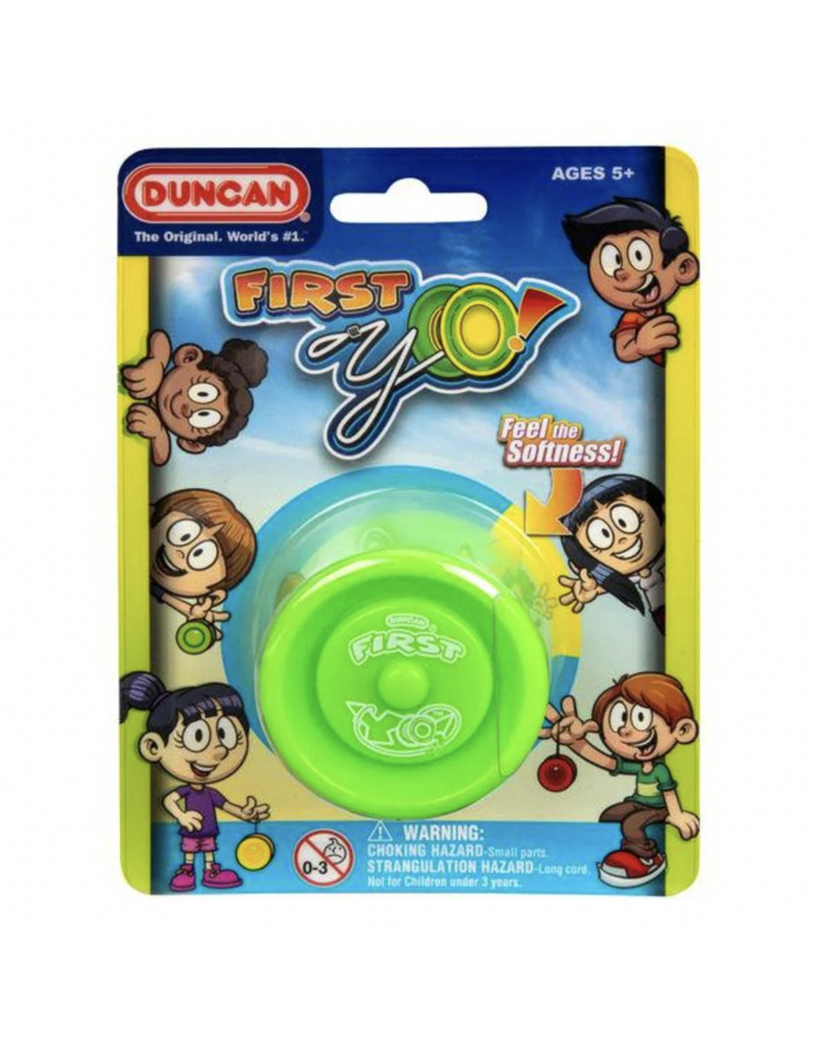 Featuring a soft rubber body and extremely responsive performance, all early learners get immediate satisfaction and success with Duncan's "First Yo" Duncan's first 5+ rated yo-yo has a shorter string and give confidence for all beginners with the yo-yo returning to your hand without even a tug. From here they can advance much easier.