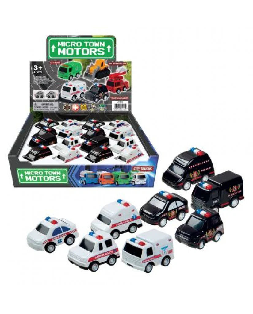 Micro town motors cars are all pullback action. Pull them back and let them goooooo! These emergency vehicles are sure to get to their destination with plenty of time to spare. This 16 pack of police and ambulance vehicles is perfect for a themed birthday party - great party favors!