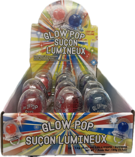 Glow Pops are a spin on the classic retro candy, Ring Pop, where there's a button underneath the ring that when pushed lights up your candy, doubling as an accessory. Flavours include Blue Raspberry, and Strawberry,