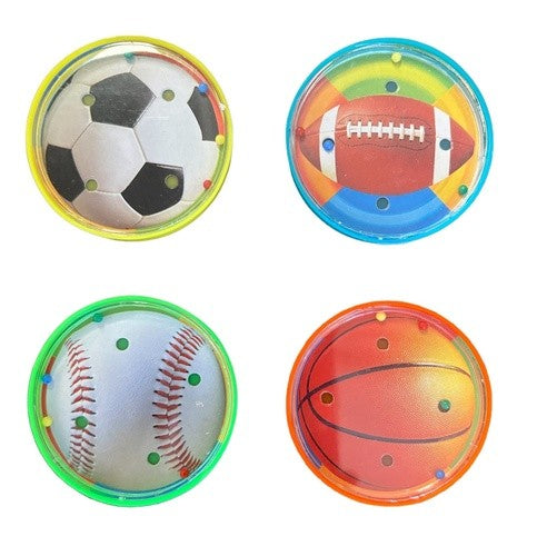 Single player sports themes mazes. Place all the balls in the groove to win! These make nice party favors or classroom rewards, and are perfect fun for in the car or airplane.