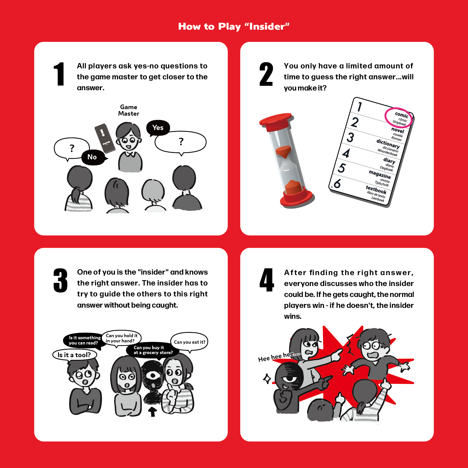 In Insider, players are assigned roles at random. One player is the "master", and they secretly select a word from a set given in a deck of cards. The "insider" player, whose role is not known to the other players, will then secretly view the word. The rest of the players are known as "commons". The commons then have approximately five minutes in which to ask the master "yes" or "no"-type questions so that they can deduce the secret word. The insider attempts to secretly lead the commons towards the correct word.