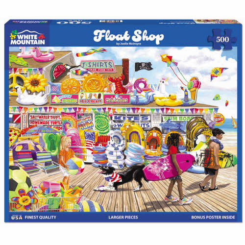 1854pz Float Shop. Stop at the float shop for all your beach needs. Not only do they offer inflatables in all shapes and sizes, the float shop can assist with all your beach needs and guarantee a successful beach trip. From candy to ice cream and skim boards and swim suits step onto the pier and into your new favorite spot. Artist Joelle McIntyre brings the bright colors and sea breeze to you in this 500 piece jigsaw puzzle. Finished size of this puzzle is 18" x 24".