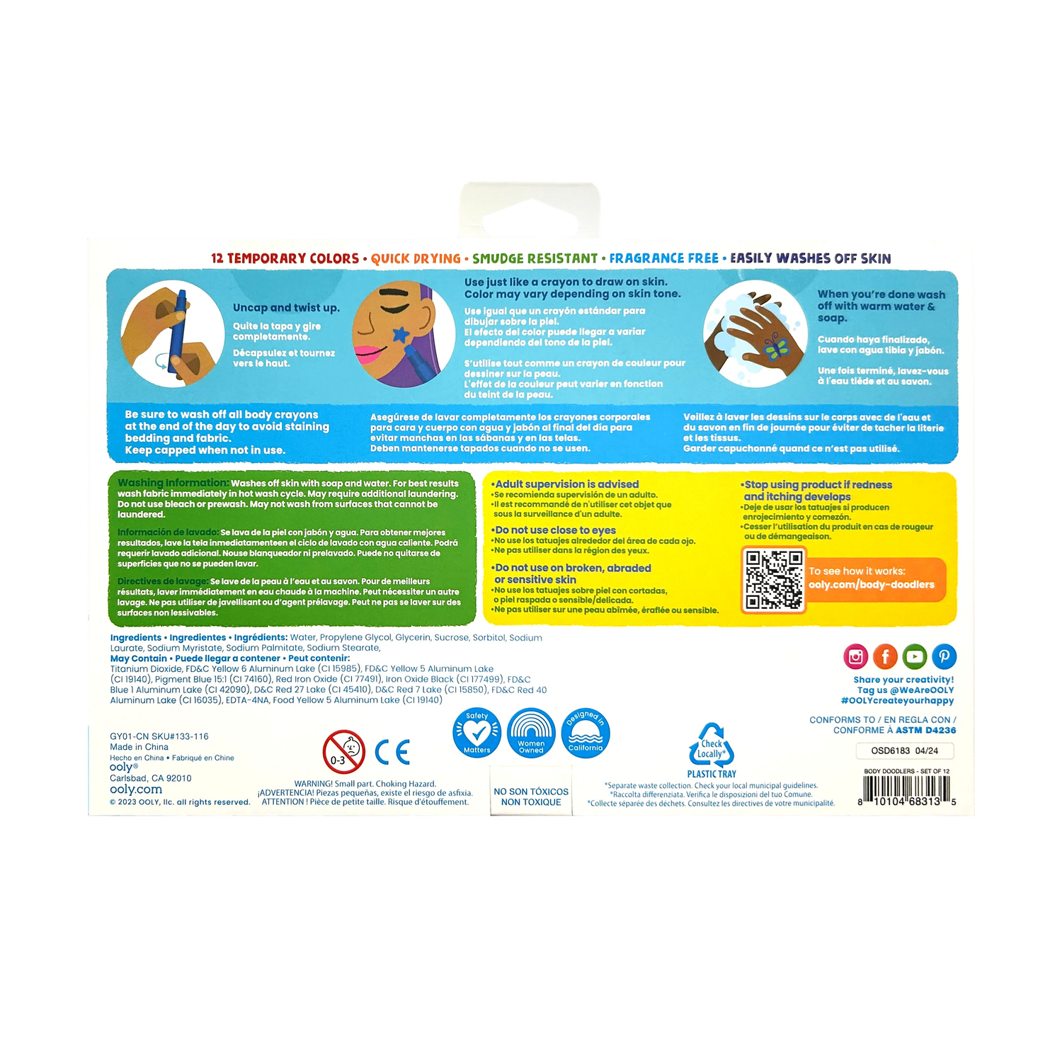 Get dressed up with body crayonsAre you feeling like a clown? A punk rocker? A human flower? Express those whims with this set of face and body crayons! It includes 12 temporary colors so you can transform yourself into whatever you dream up, and then easily wash it off whenever you want. Each non-toxic body crayon twists up so you can add more color whenever you need. Body art crayons are great for adding activities like face painting to a birthday party, or for turning a humdrum afternoon into a creative adventure!●Set of 12 face and body crayons for temporary body art●Quick drying and easily washes off●Twist up action to protect crayons●Colors may appear lighter or darker depending on skin tone●Non-Toxic●Suitable for ages 6 and up