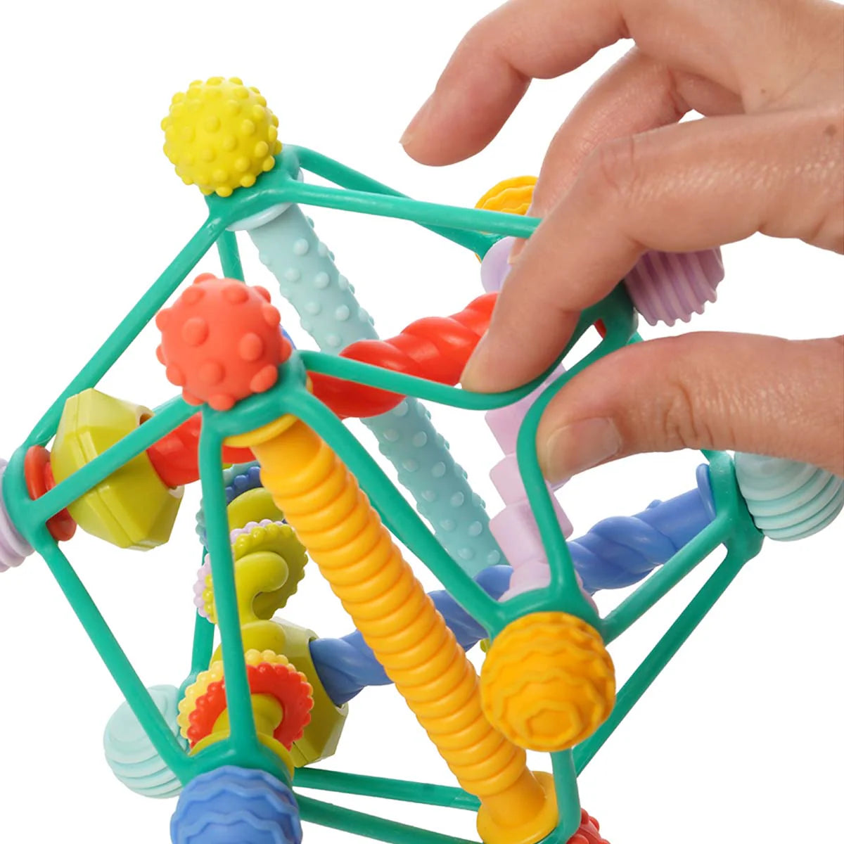 Made with plastic rods and strung together with flexible plastic cording, the Whirzle squishes and rebounds easily and has colorful, textured nubs on each rod for teething. Shake to see colorful rings and beads spin up and down the plastic rods, encouraging cause-and-effect learning.