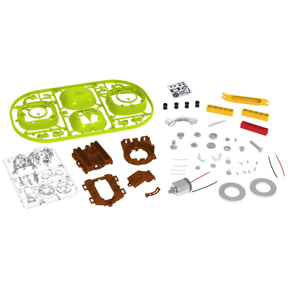 An apple that defies gravity and walks a tightrope — what would Isaac Newton have thought? Build a cute apple robot that walks along a tightrope. How? Thanks to the robot’s main component, a motorized gyroscope, it can maintain its balance and perform this fun trick without falling over. Through five experiments, you can discover the astonishing powers of the motorized gyroscope and explore the physics behind its amazing behaviors. Experiment with getting the gyrobot to walk on the different included tracks and on a string, investigate the gyrobot’s center of gravity, play a ring-toss game, and watch the gyrobot spin on a flat surface.
