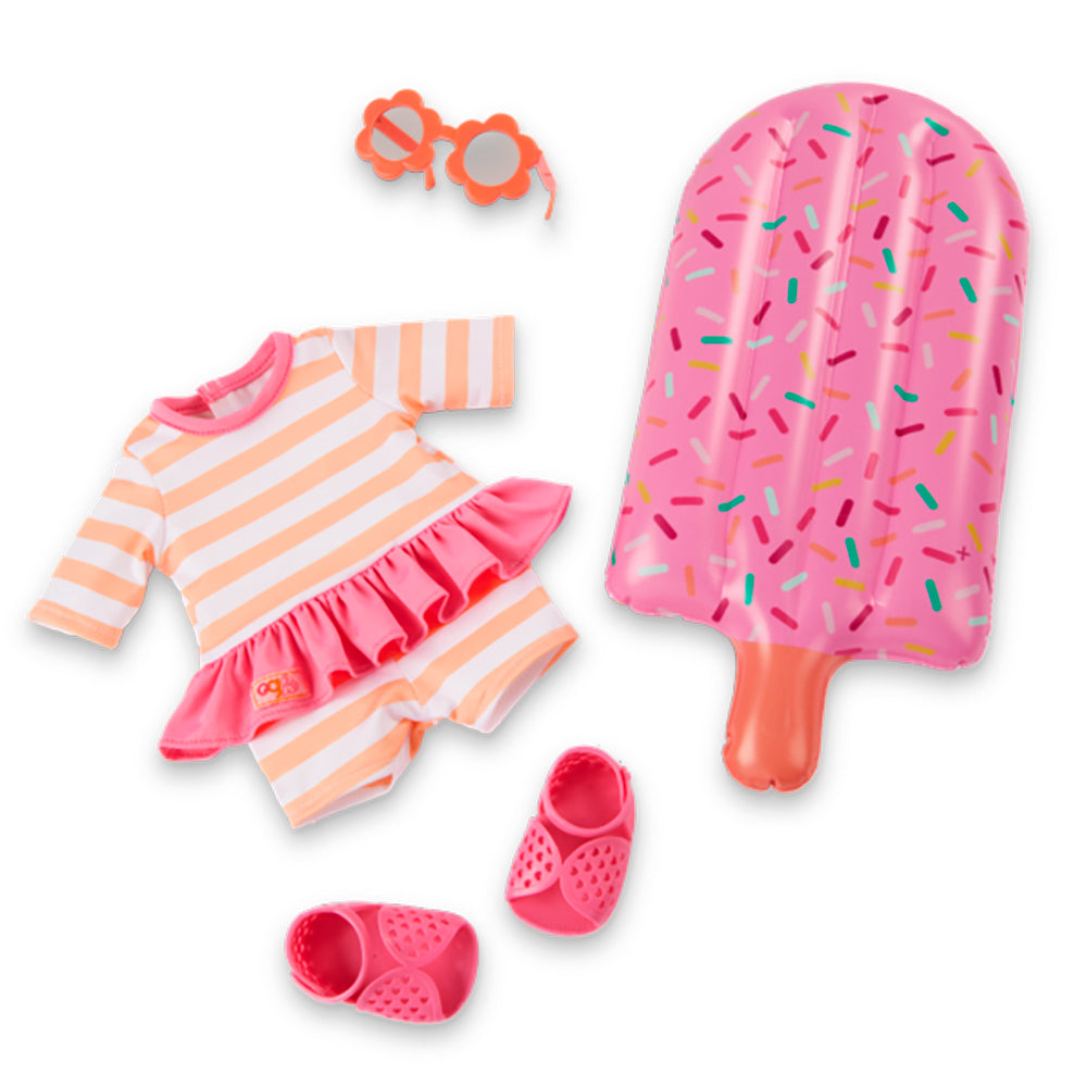 Dressed for fun in the sun, she wears a striped swimsuit with a pink frilly waist, peep-toe sandals with mini heart cutouts, and floral sunglasses that add a splash of cuteness. Plus, Margot comes with a pink popsicle-themed pool float that inspires pretend swimming and sweet storytelling. It features a rainbow sprinkle print and even inflates like a real floatie! Margot has lifelike details that will delight doll fans during playtime, from her adorable freckles and brushable blonde hair to her beautiful blue eyes that open and close. And for kids who love dress-up, her outfit has easy-open closures to quickly put on and remove. So they can mix, match, and create more fun looks!Â