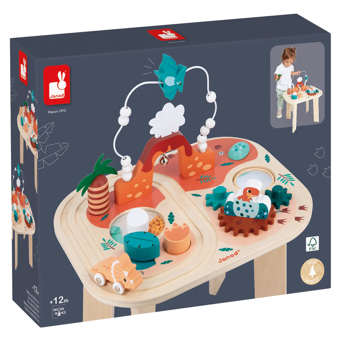 Travel back to the time of the dinosaurs and immerse your child in a larger than life atmosphere with this superb activity table. The triceratops rolls on its circuit, passes under the volcano and touches the bell which goes "ding ding". Attention ! The volcano is about to erupt! The smoke is already taking shape thanks to the felt and the abacus. On the latter, a small Pteranodon flies from one end of the volcano to the other, accompanied by 10 wooden beads. Right next to the volcano is a palm tree to stack, do and undo endlessly. On the other side of the table, a baby T-rex comes out of its egg, it spins with its three gears. Is there something hidden under the sheet? and under the footprints? 2 chunky pieces to be repositioned. What happens when you turn the eggs? Noise, animations, it turns, it turns! A distorting rotating mirror ensuring giggles completes the whole thing. In total, the table has 8 activities for long hours of play. Your child will be able to have fun while developing his dexterity and his imagination. FSCTM wooden awakening toy. The height of the top is 32 cm to facilitate access for the little ones. Activity table for children from 12 months.
