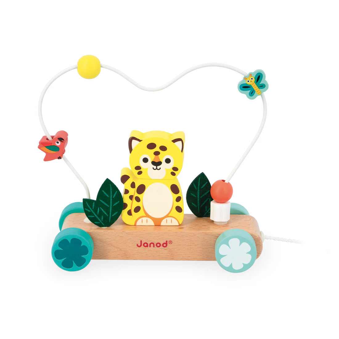 The Janod Tropik Jaguar Pull-Along is a wooden early-learning toy designed for children aged 12 months and up. This 2-in-1 toy features a pull-along jaguar composed of two stackable parts seated on a stand with felt foliage. An integrated five‑bead abacus adds a tactile element to play. The 50 cm cotton string encourages gross motor development while the stacking and bead sliding support fine motor skills and color recognition. Made from FSC®‑certified wood with water-based paint, this vibrant toy reflects the exotic Tropik theme. Compact and durable, it enhances walking activity, sensory engagement, and imaginative play. Approximate dimensions: 19 × 7.5 × 17 cm.
