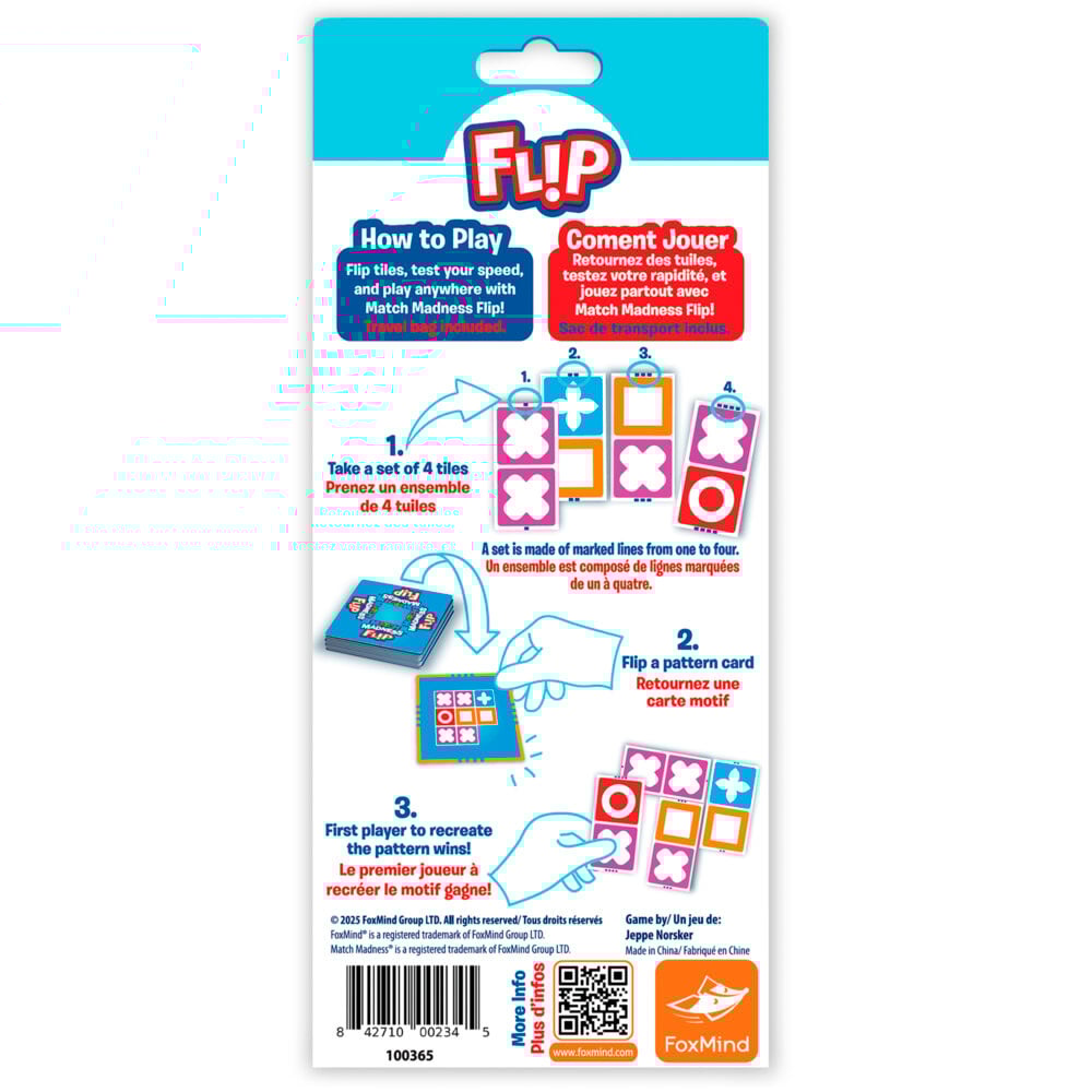 Take Match Madness Flip wherever you go! Both players take a set of 4 double-sided acrylic tiles and flip a card. Race to match the pattern on the card to win! This travel edition features 100 brand-new puzzles on waterproof cards, 8 waterproof tiles, and a convenient waterproof travel bag for on-the-go fun!