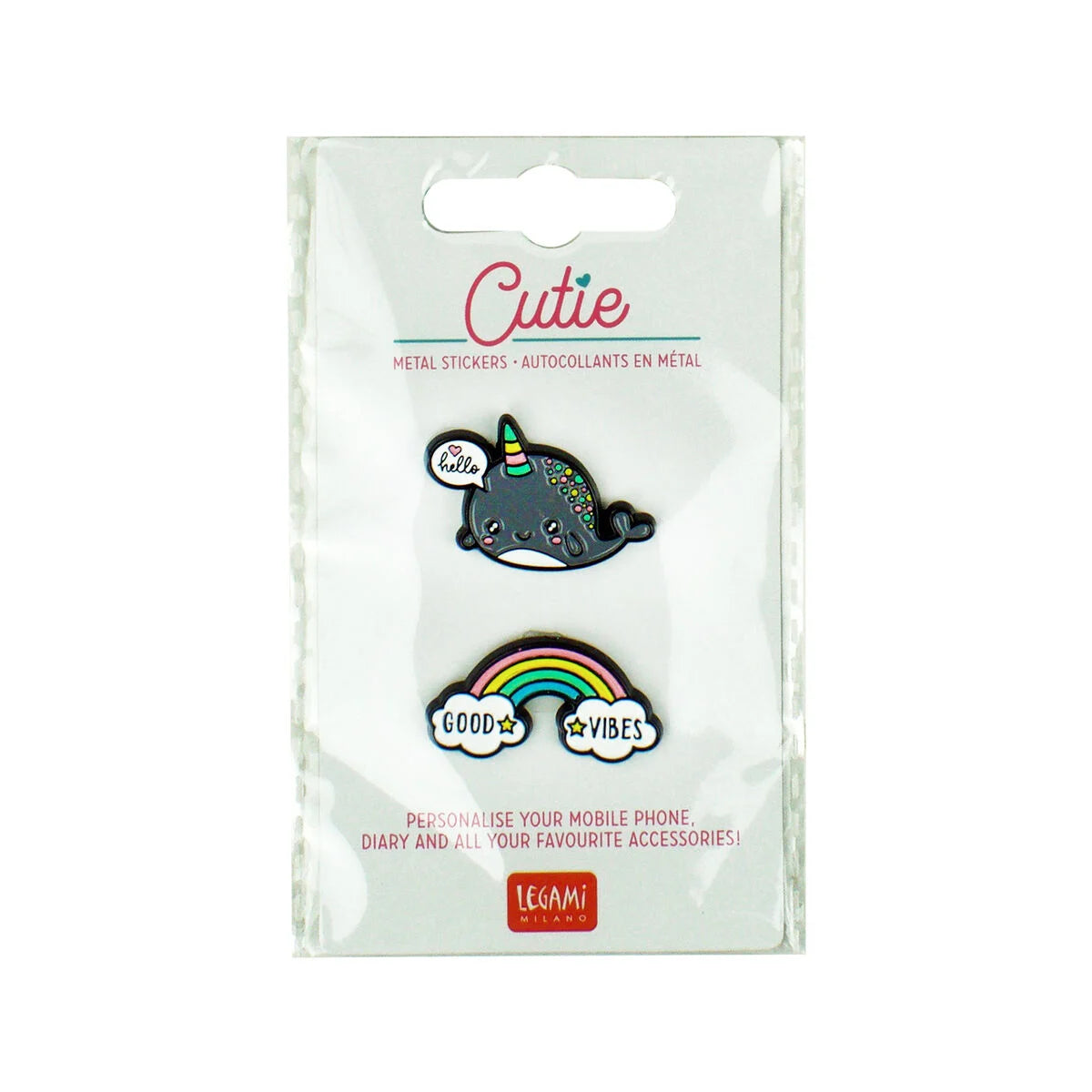 Personalise your devices, diary and belongings with this irresistibly sweet Legami Cutie Set of 2 Metal Stickers. Featuring a magical narwhal and a 'Good Vibes' rainbow, these metal stickers will jazz up your stuff and help you be yourself. Simply clean the surface with a cloth, peel off the backing paper and place the sticker onto the surface, applying a bit of pressure to make sure it is properly attached. Leave for 10 minutes to allow the adhesive to work, and you're ready to take your newly customised objects out on the town!