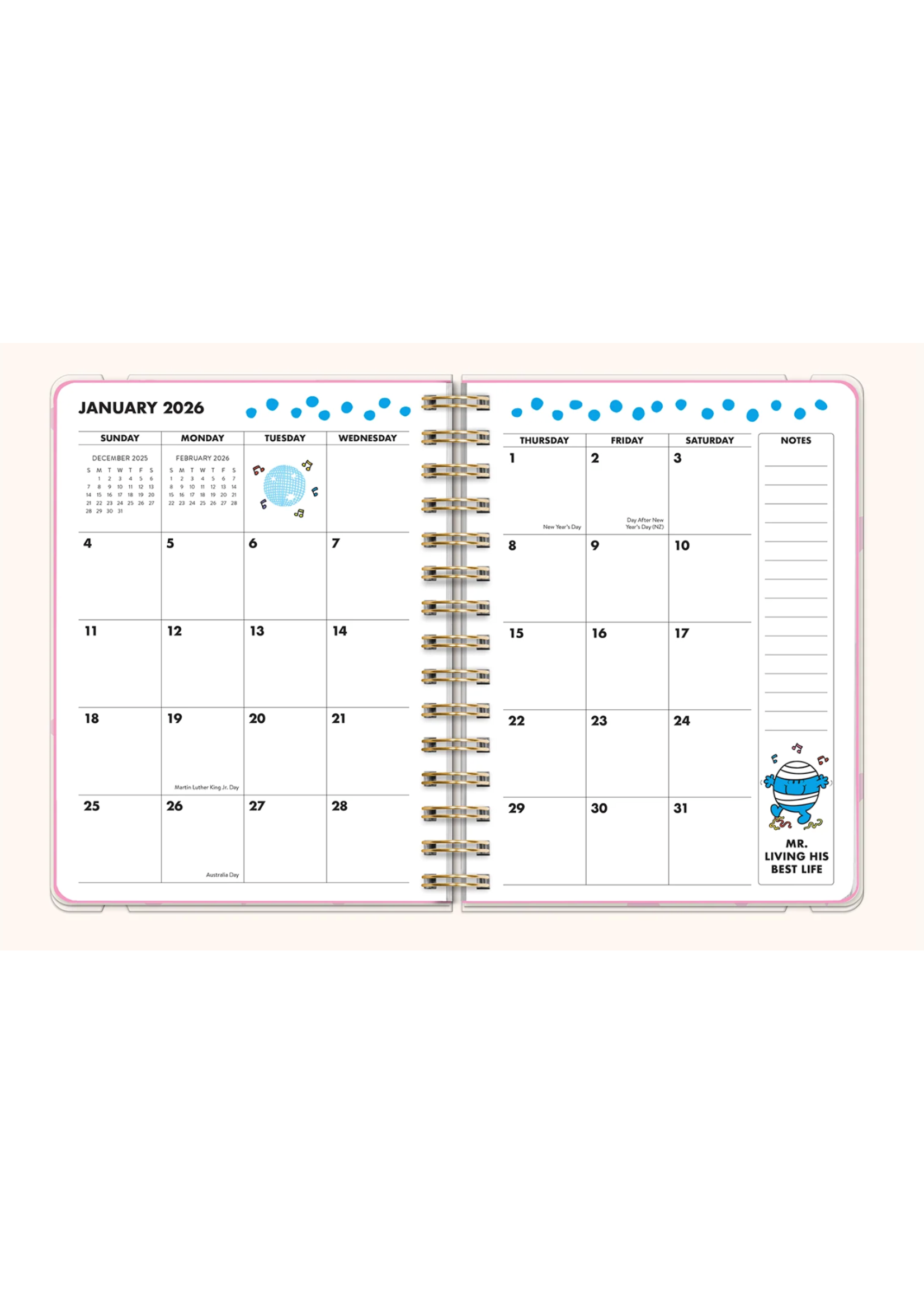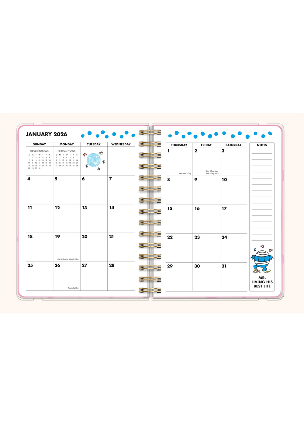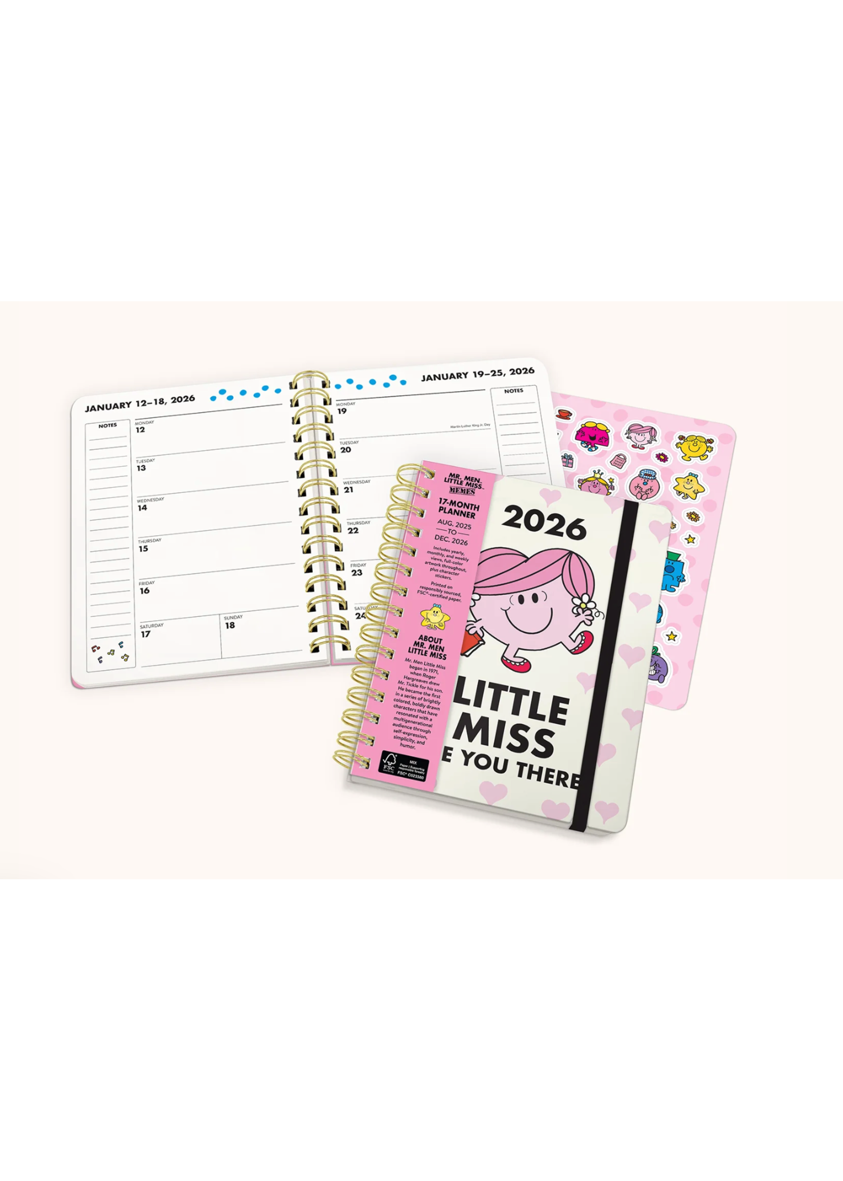 Plan your year with the characters from Mister Men Little Miss™! This perfectly portable planner from Orange Circle Studio will keep you up-to-date on appointments and plans for your new year. Each page of the Deluxe Compact Flexi Planner (August 2025 to December 2026) features full-colour illustrations, and the monthly and weekly views provide ample space to jot down plans and important dates. Extra notes pages for doodling or journaling and a full-color sticker sheet make this all-in-one organizing tool a must-have!